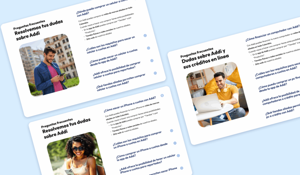 En cuanto al diseño, se trabajó a partir de un sistema modular que facilitó la organización de los contenidos y permitió jugar con colores, imágenes y tamaños de manera estratégica. Todo se desarrolló cumpliendo con el manual de marca de Addi, garantizando coherencia visual con el sitio web principal y con la comunicación desplegada en redes sociales y pauta digital.